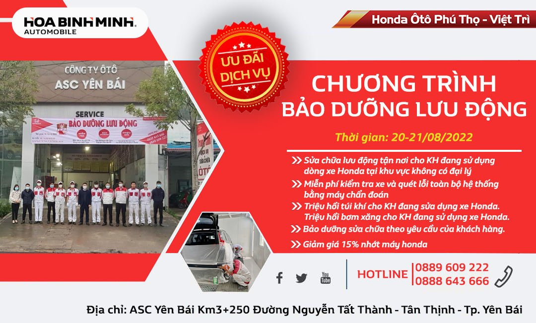 Đại lý Honda Ô tô Phú Thọ - Việt Trì xin trân trọng giới thiệu thời gian và địa điểm tổ chức chương trình bảo dưỡng lưu động tại Thành phố Yên Bái