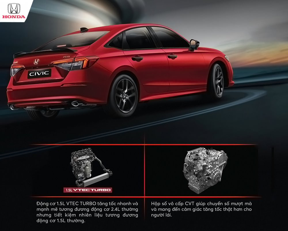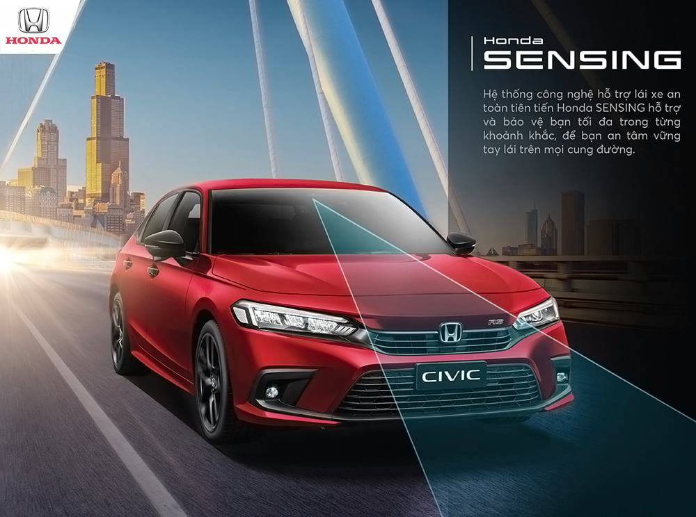 ALL NEW CIVIC - Sức mạnh vượt trội phân khúc sendan hạng C với khối động cơ 1.5L VTEC TURBO sản sinh 176 mã lực (mạnh mẽ nhất phân khúc). Honda Civic 2022 đem đến một thiết kế hoàn toàn mới - sang trọng, thời thượng hơn. Đi cùng với đó là kết nối thông minh Honda Connect và trang bị gói công nghệ hỗ trợ an toàn tiên tiến Honda SENSING sẽ làm bạn an tâm vượt mọi hành trình.