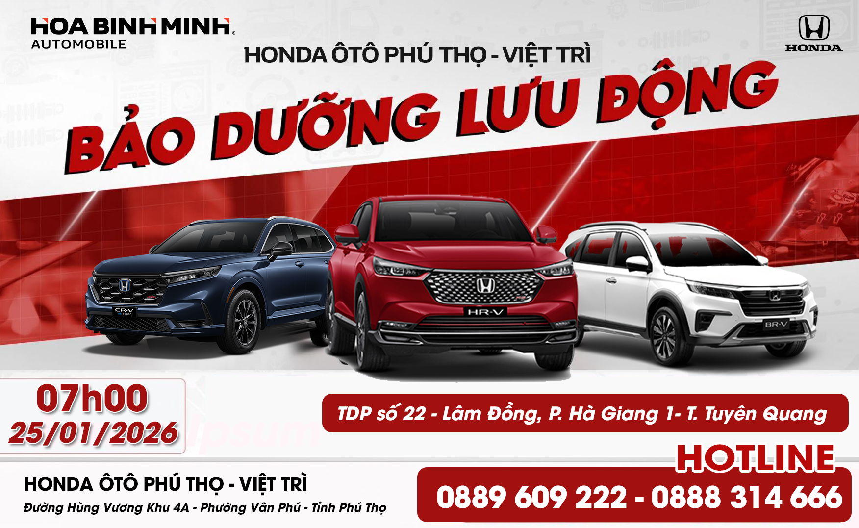 Honda Ô tô Phú Thọ - Việt Trì xin thông báo tới toàn thể quý khách hàng chương trình: Bảo dưỡng lưu động – tại Thành phố Hà Giang (cũ)